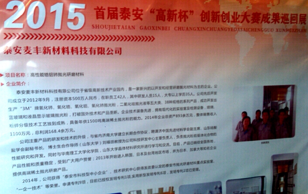 2015年10月30日上午,我公司參加首屆泰安“高新杯”創(chuàng)新創(chuàng)業(yè)大賽成果巡回展,為高新區(qū)及各駐泰高校展示大賽獲獎(jiǎng)科技成果。我公司“高性能鋯鋁鈰拋光研磨材料”項(xiàng)目榮獲企業(yè)組三等獎(jiǎng)。